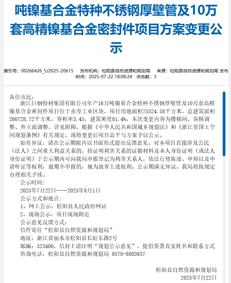 2025年7月22日,浙江巨鋼特材集團(tuán)有限公司年產(chǎn)16萬噸鎳基合金特種不銹鋼厚壁管及10萬套高精鎳基合金密封件項目方案變更公示,公示時間:2025年7月22日-2025年8月1日。