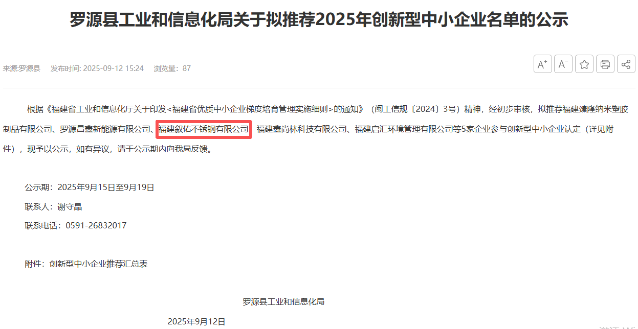 2025年9月12日,羅源縣工業(yè)和信息化局就擬推薦2025年創(chuàng)新型中小企業(yè)名單對外進(jìn)行公示。