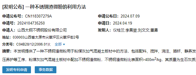 2024年7月9日,山西太鋼不銹鋼股份有限公司成功申請(qǐng)一項(xiàng)名為“一種不銹鋼渣微粉的利用方法”專利,申請(qǐng)公布號(hào)為CN118307279A,申請(qǐng)日期為2024年4月19日。