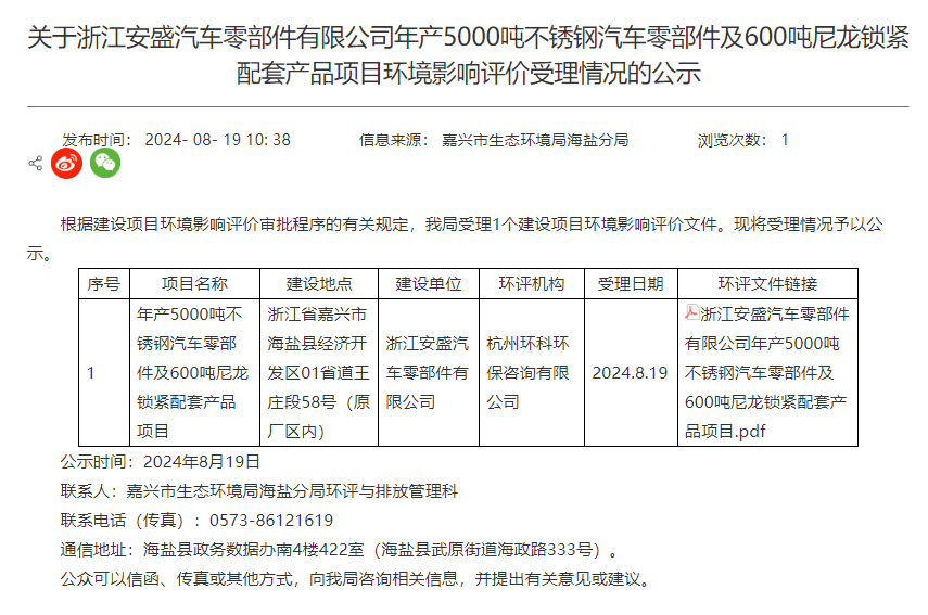 8月19日,嘉興市生態(tài)環(huán)境局海鹽分局受理浙江安盛汽車零部件有限公司年產(chǎn)5000噸不銹鋼汽車零部件及600噸尼龍鎖緊配套產(chǎn)品項(xiàng)目環(huán)境影響評價報告表并對外進(jìn)行公示。