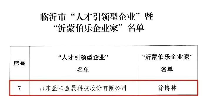 其中,山東盛陽(yáng)金屬科技被評(píng)選為“人才引領(lǐng)型企業(yè)”,集團(tuán)總裁徐博林被授予“沂蒙伯樂(lè)企業(yè)家”榮譽(yù)稱(chēng)號(hào)。