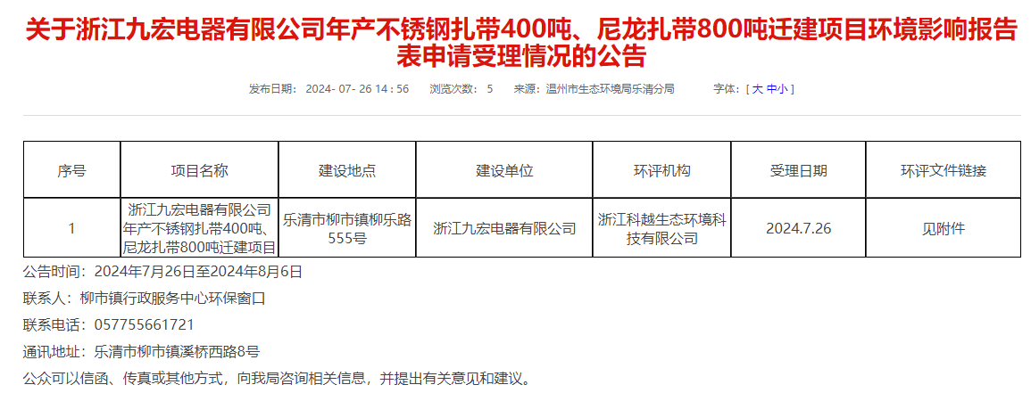 7月26日,溫州市生態(tài)環(huán)境局樂清分局受理浙江九宏電器有限公司年產(chǎn)不銹鋼扎帶400噸、尼龍扎帶800噸遷建項目環(huán)境影響報告表并對外進行公告,公告時間:2024年7月26日至2024年8月6日。