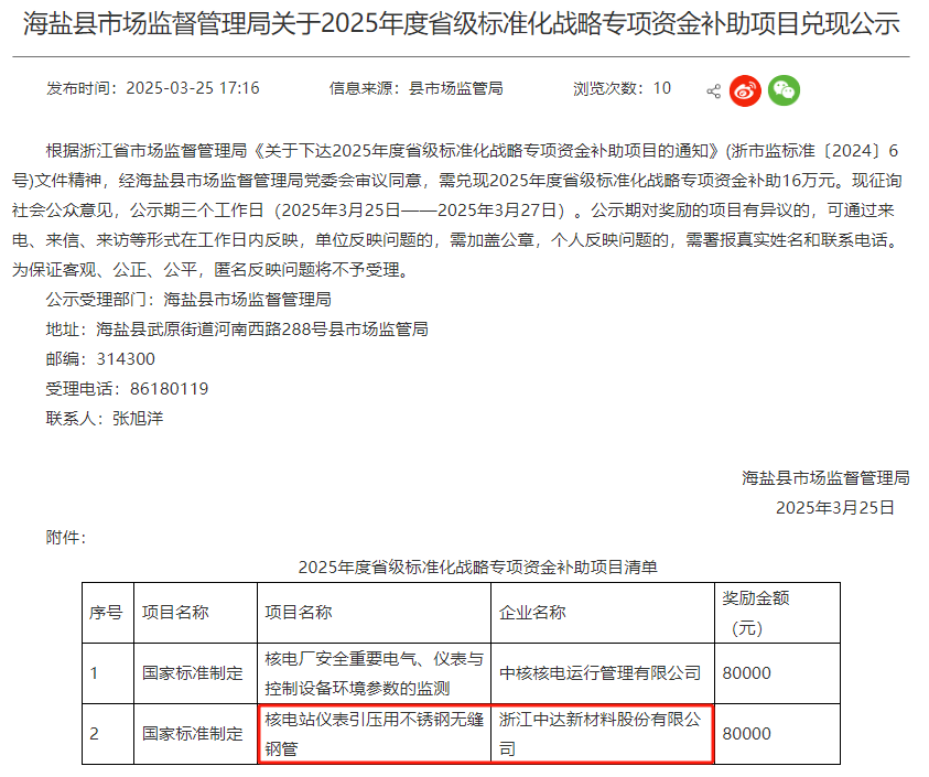 據(jù)顯示,浙江中達新材料股份有限公司核電站儀表引壓用不銹鋼無縫鋼管項目獲獎勵金額80000元。
