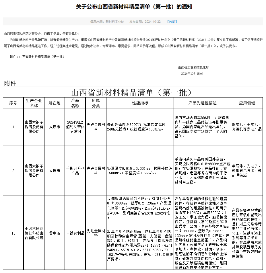 據(jù)清單顯示,山西太鋼不銹鋼股份有限公司SUS430LX超純鐵素體不銹鋼、手撕鋼系列產(chǎn)品和中綱不銹鋼管業(yè)科技山西有限公司不銹鋼制品均入選。