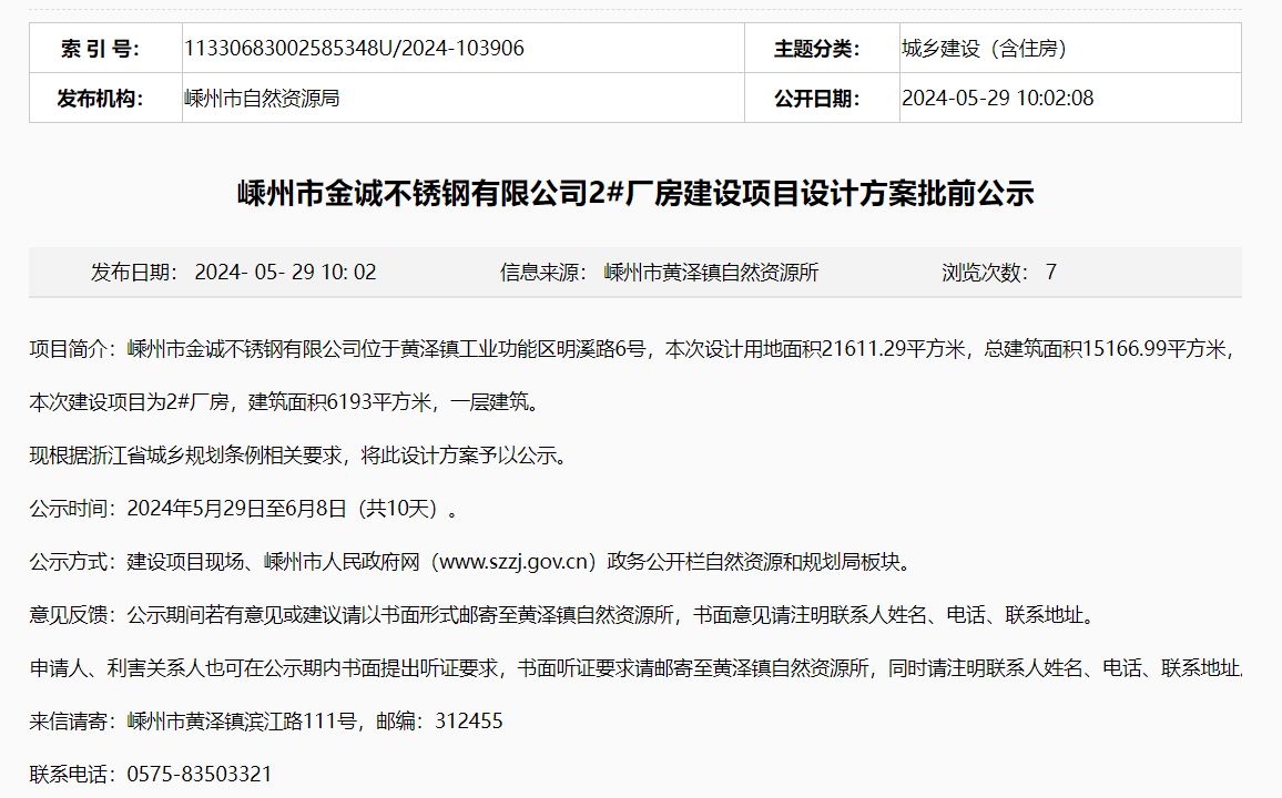 5月29日,嵊州市黃澤鎮(zhèn)自然資源所就嵊州市金誠不銹鋼有限公司2#廠房建設(shè)項目設(shè)計方案對外進(jìn)行批前公示,公示時間:2024年5月29日至6月8日(共10天)。