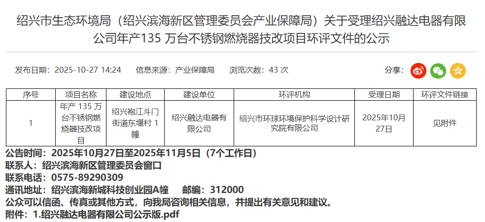 2025年10月27日,紹興市生態(tài)環(huán)境局受理紹興融達(dá)電器有限公司年產(chǎn)135萬(wàn)臺(tái)不銹鋼燃燒器技改項(xiàng)目環(huán)評(píng)文件并對(duì)外進(jìn)行公示,公示時(shí)間:2025年10月27日至2025年11月5日(7個(gè)工作日)。