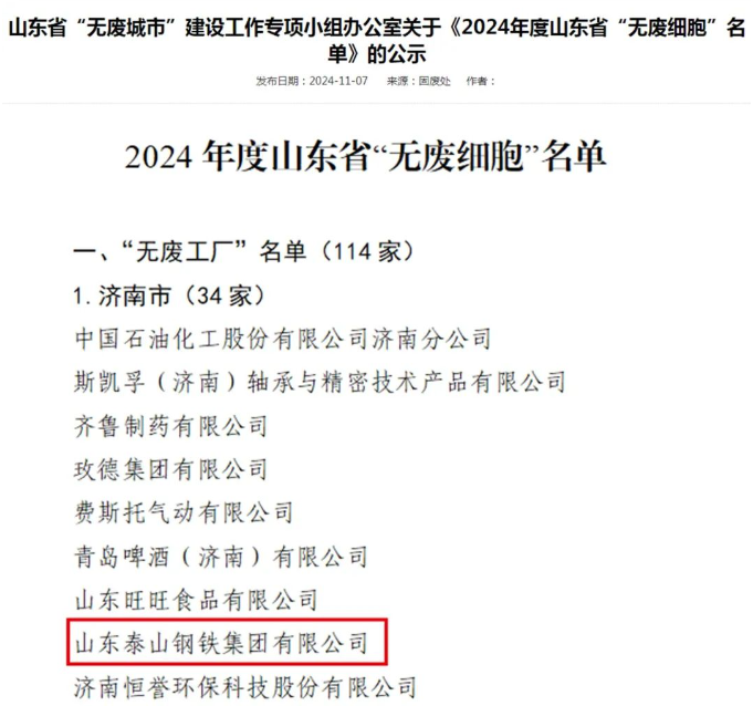 11月7日,山東省生態(tài)環(huán)境廳公布2024年度山東省“無廢細胞”名單,泰山鋼鐵集團獲評首批省級“無廢工廠”。